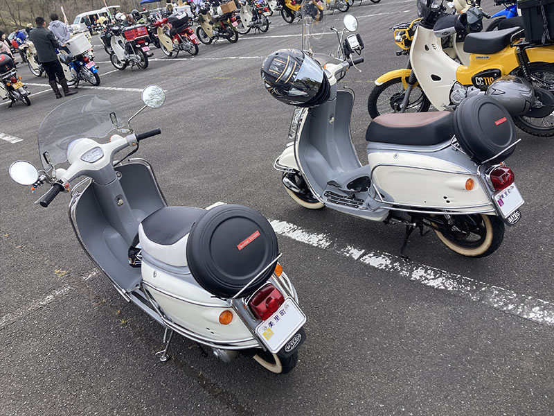 来てたカブもほとんど見れなかったんですが、お店から割と近いところにいたこの2台がとっても気になってパパッと一瞬だけ行ってササッと1枚写真撮ってきました。同色のジョルカブなんて珍しい~と思いきや、よく見ると手前の方にはペダルが無い。実はジョルノとジョルカブのペアルックだったんです。色はもちろん、背負ったスペアタイヤ(ですか?)カバー等のアクセサリーもお揃いで、全体的にセンスがとっても良い。残念ながらオーナーさんとお話する機会は得られませんでしたが、次にどこかで見かけたらこの2台のヒストリーも聞いてみたいですね。