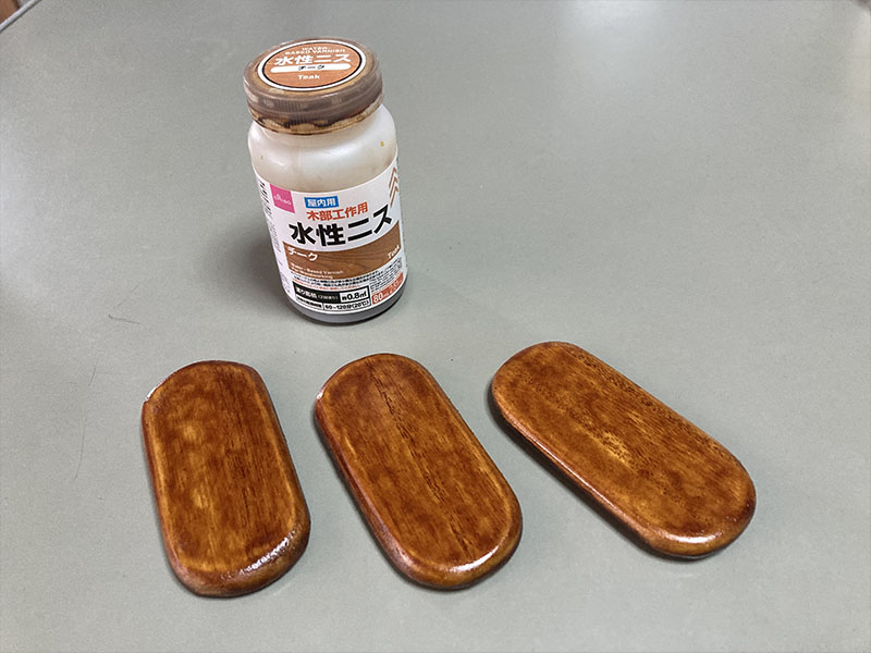 できたパーツを同じく100均で買ってきたニスを塗って仕上げます。材料費トータル220円(笑)