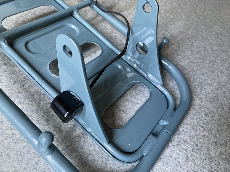 今までのキャリアは箱の底に埋まるように前方の立ち上がりをカットしてあり、箱を外して丸見えになるとカッコ悪いので、全塗装する際に一緒に塗ってもらっていた無加工のリトルカブ純正キャリアに交換。ウインカーは箱に使ってたLEDウインカーを外してキャリア側面の穴を利用してセットします。